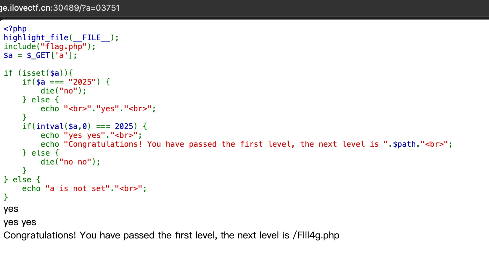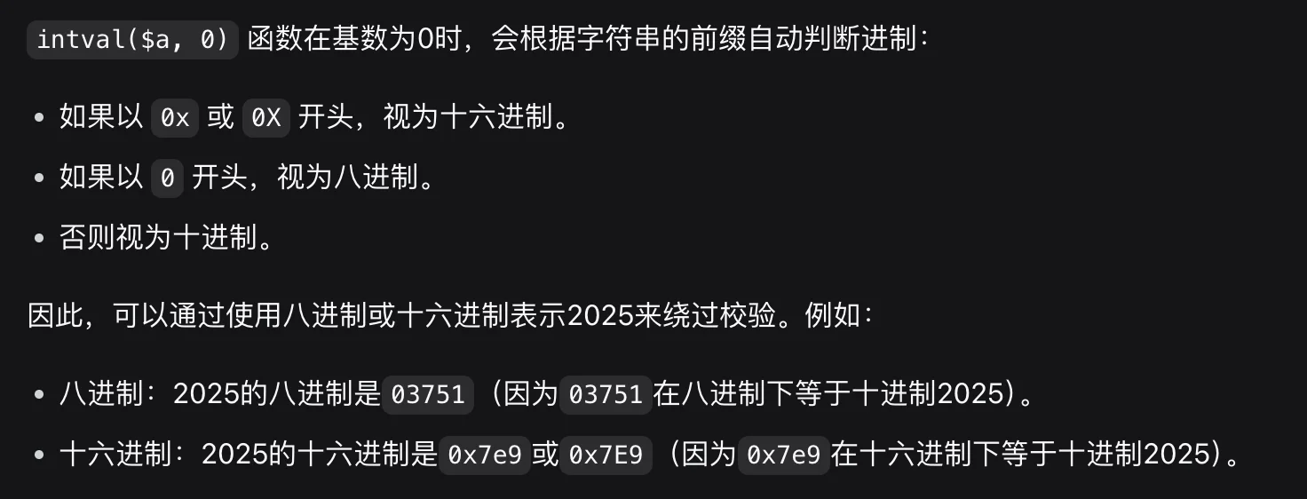 题目需要!$a === "2025" and intval($a, 0) === 2025