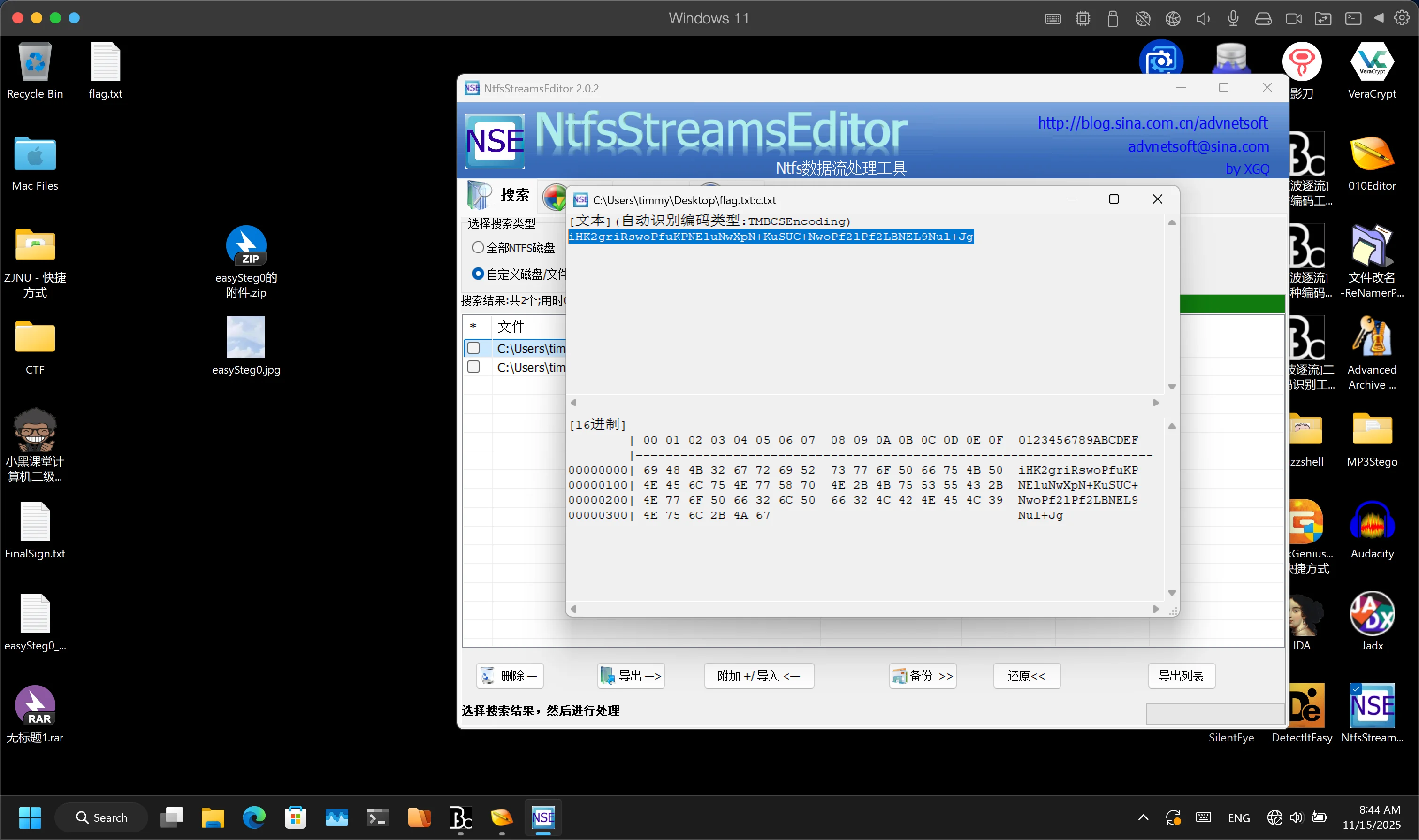 图片尾包含一个rar,分离,解压得到flag.txt,存在ntfs流隐写